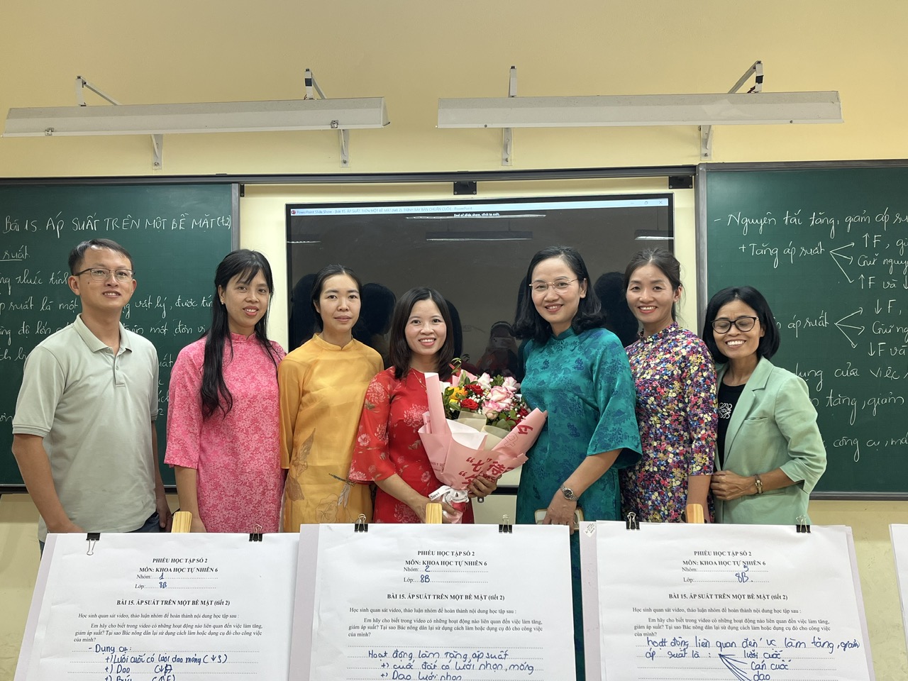 Những gương mặt rạng rỡ của đồng nghiệp và các em học sinh lớp 8B sau khi kết thúc tiết dạy