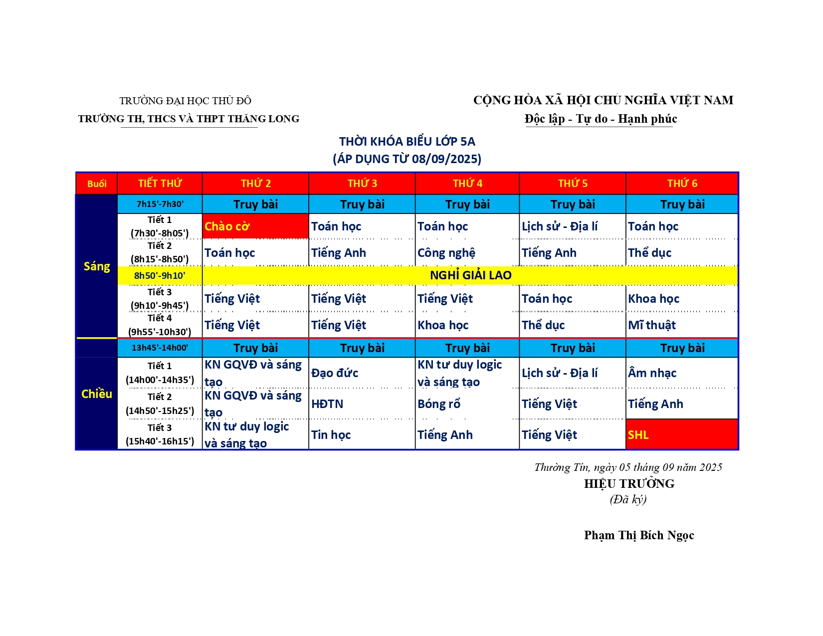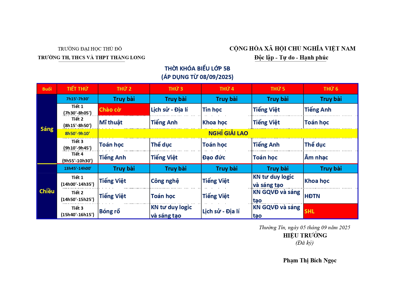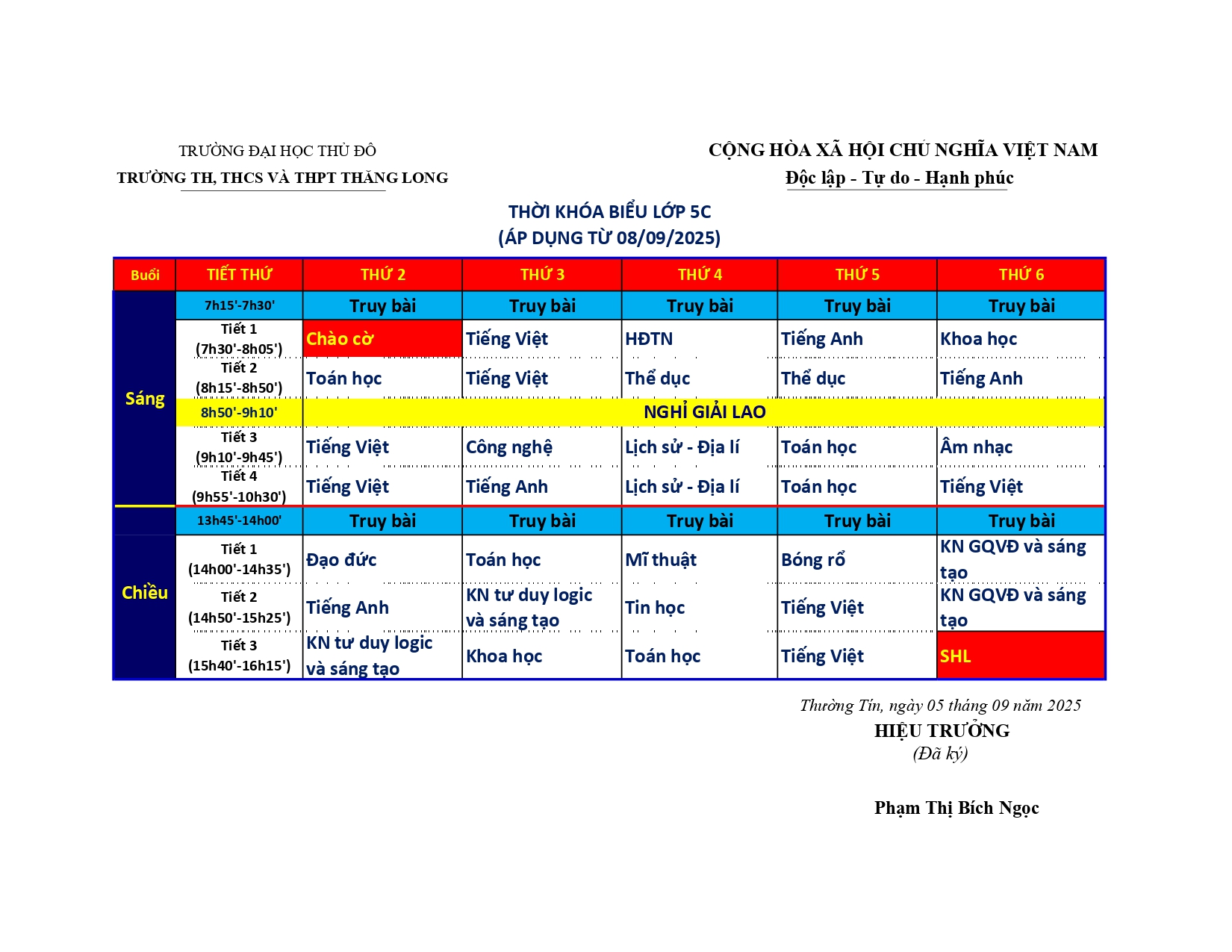 THỜI KHOÁ BIỂU KHỐI 5 HỌC KÌ I NĂM HỌC 2025-2026
