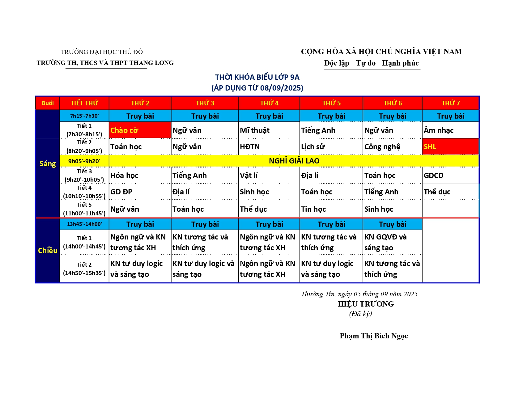 THỜI KHOÁ BIỂU KHỐI 9 HỌC KÌ I NĂM HỌC 2025-2026